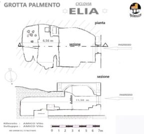 La piccola cavità si trova a pochi metri dalla strada comunale132 Santoro 1 che conduce alla strada provinciale 14 Ostuni-Martina Franca, vicina alla ciclovia dell'Acquedotto Pugliese. Una piccola costruzione a volta in pietra precede la grottina; il locale rustico misura circa 5,50 metri di lunghezza per 4,50 metri di larghezza, mentre la cavità è lunga 5,60 metri e larga 4,80 metri. Queste caratteristiche suggeriscono un uso agro pastorale del sito, verosimilmente un antico palmento scavato nella roccia calcarea per la pigiatura dell'uva. * Il palmento o palmiento è una vasca larga e poco profonda, scavata nella roccia impermeabile, usata dalla nostra "civiltà contadina" per la pigiatura e la fermentazione dei mosti. I palmenti sono localizzati nei trulli, nelle masserie e anche in cavità naturali. Cavità, come la grottina Palmento Ciclovia testimoniano l’ingegno delle comunità contadine che per secoli hanno sfruttato il territorio carsico adattandolo alle esigenze dell’agricoltura e della vinificazione. |