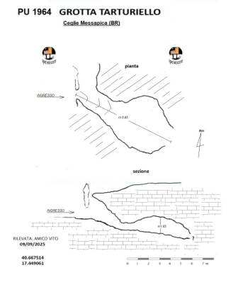 Questa grotta è sita nella contrada Tamburi, non molto distante dall'omonima masseria, ubicata a nord est a circa due chilometri dal centro abitato. Abbiamo fatto un giro di ricognizione e rilevato la caverna, con stupore rileviamo che per andare in grotta è presente una scalinata che dal fabbricato ci conduce all'ingresso della grotta. Notiamo subito la differenza con le altre cavità visitate prima: il perfetto stato di conservazione. Dall'ingresso, otto scalini ci conducono in una stanza di circa 3 metri di larghezza, per un'altezza di 2. Un pavimento in mattoni spiana il piano di calpestio, la volta pare quasi intatta, di certo antropizzata in tempi passati. Un pozzo rompe l'omogeneità della grotta che risale all'interno della pineta di 15 x 5 metri. Un cunicolo porta ad un'interruzione sicuramente ostruita da una caduta di massi, che certamente conduce in altri ambienti, come è facile ipotizzare dal notevole passaggio d'aria proveniente da due piccole aperture. grotta abate amato 2 - ceglie messapica La cavità dista 3 chilometri da Ceglie nell'omonima contrada, non lontana dalla grotta Abate Amato 1. E' stata già scoperta nel 2002 dal Gruppo Speleocem e dallo stesso studiata e bonificata dai rifiuti nel 2018. Trattasi di una grotta naturale, parzialmente concrezionata con indizi di prosecuzione. E' costituita da un unico ambiente di ventitre metri quadri.